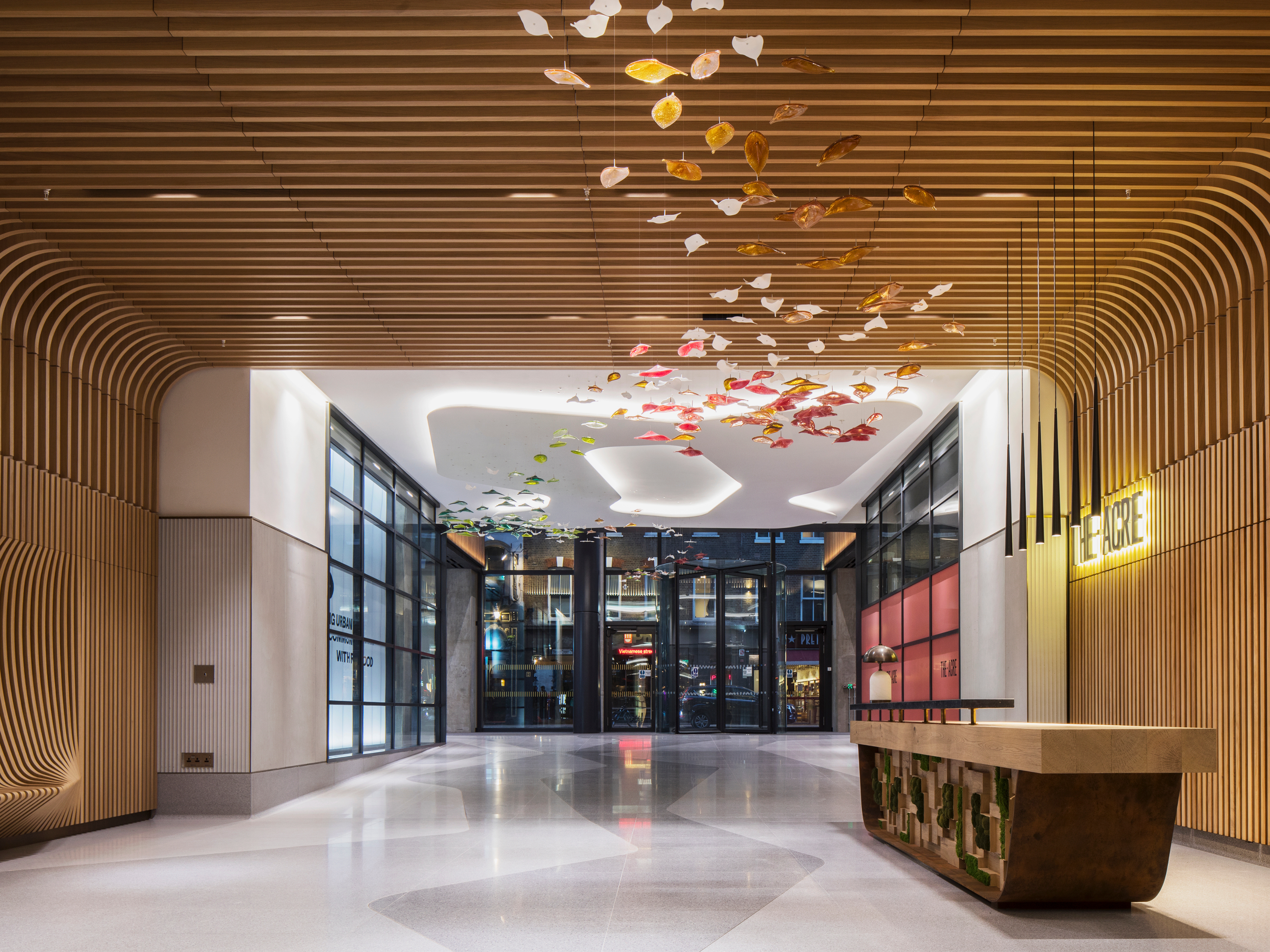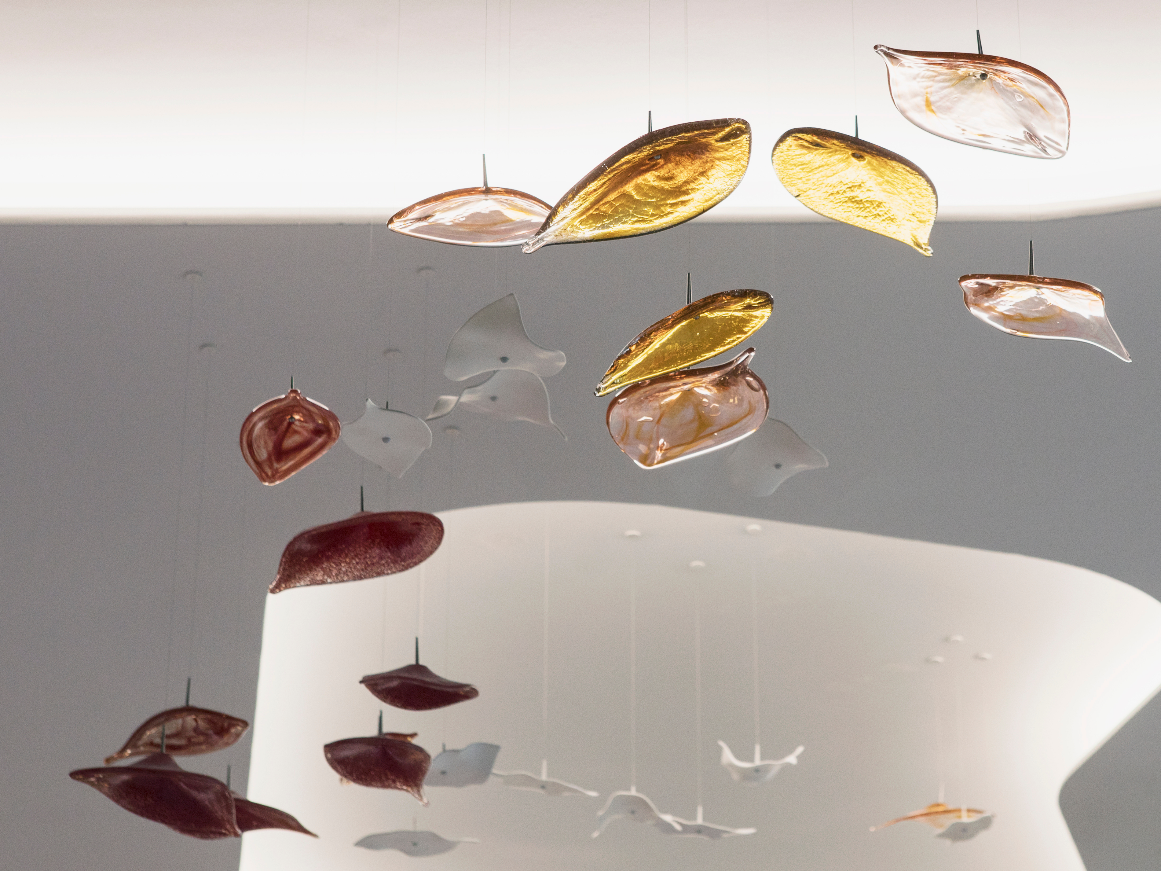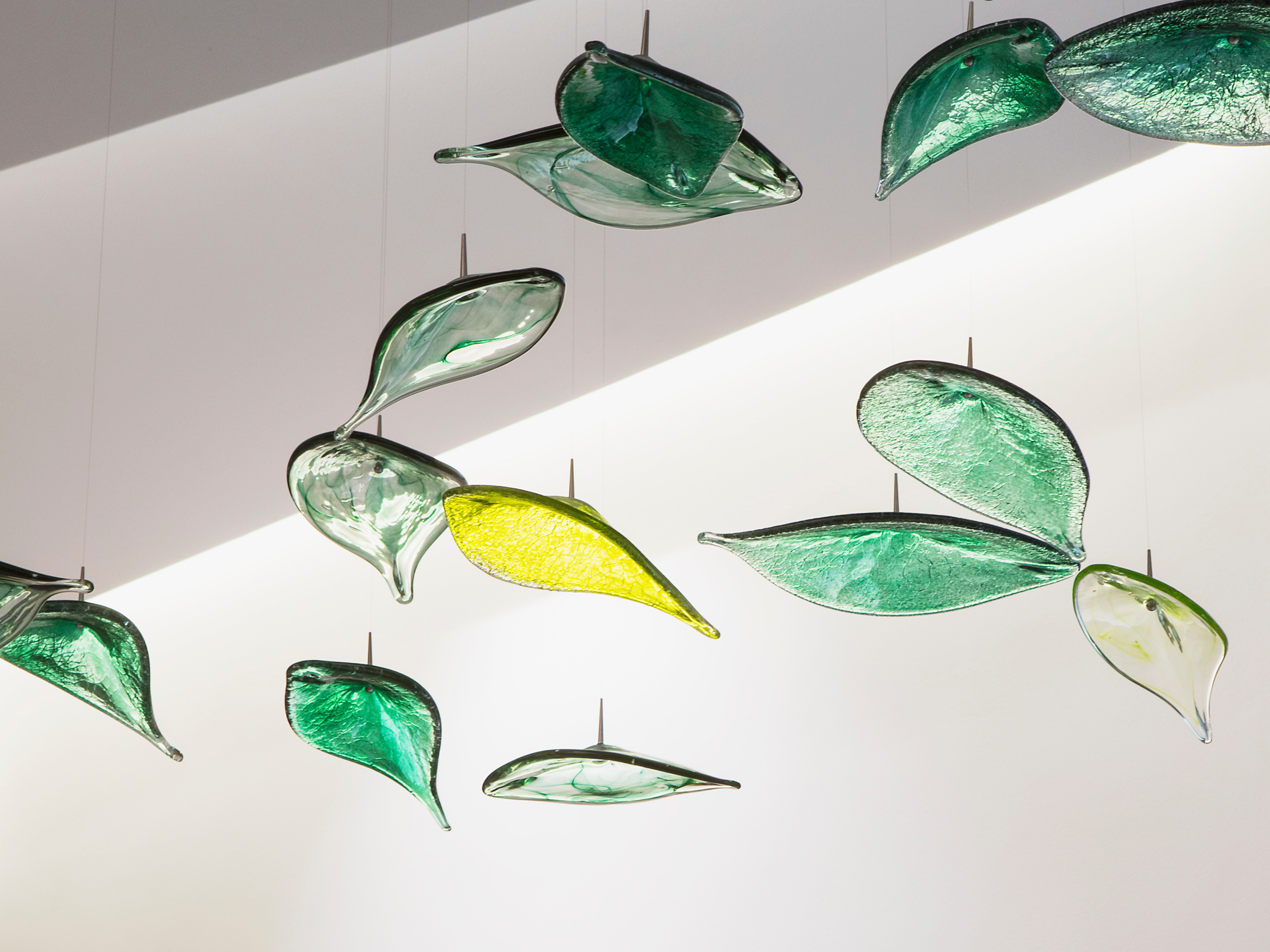 Each individual piece, suspended on near invisible, microfibre stainless steel cables, is uniquely pigmented with swirling veins and crackled textures, evoking the delicate quality of leaves in motion. As visitors journey through the space, the composition appears to flow like a breeze, shifting gradually from fresh spring greens to vibrant summer hues and finally to rich autumnal reds.