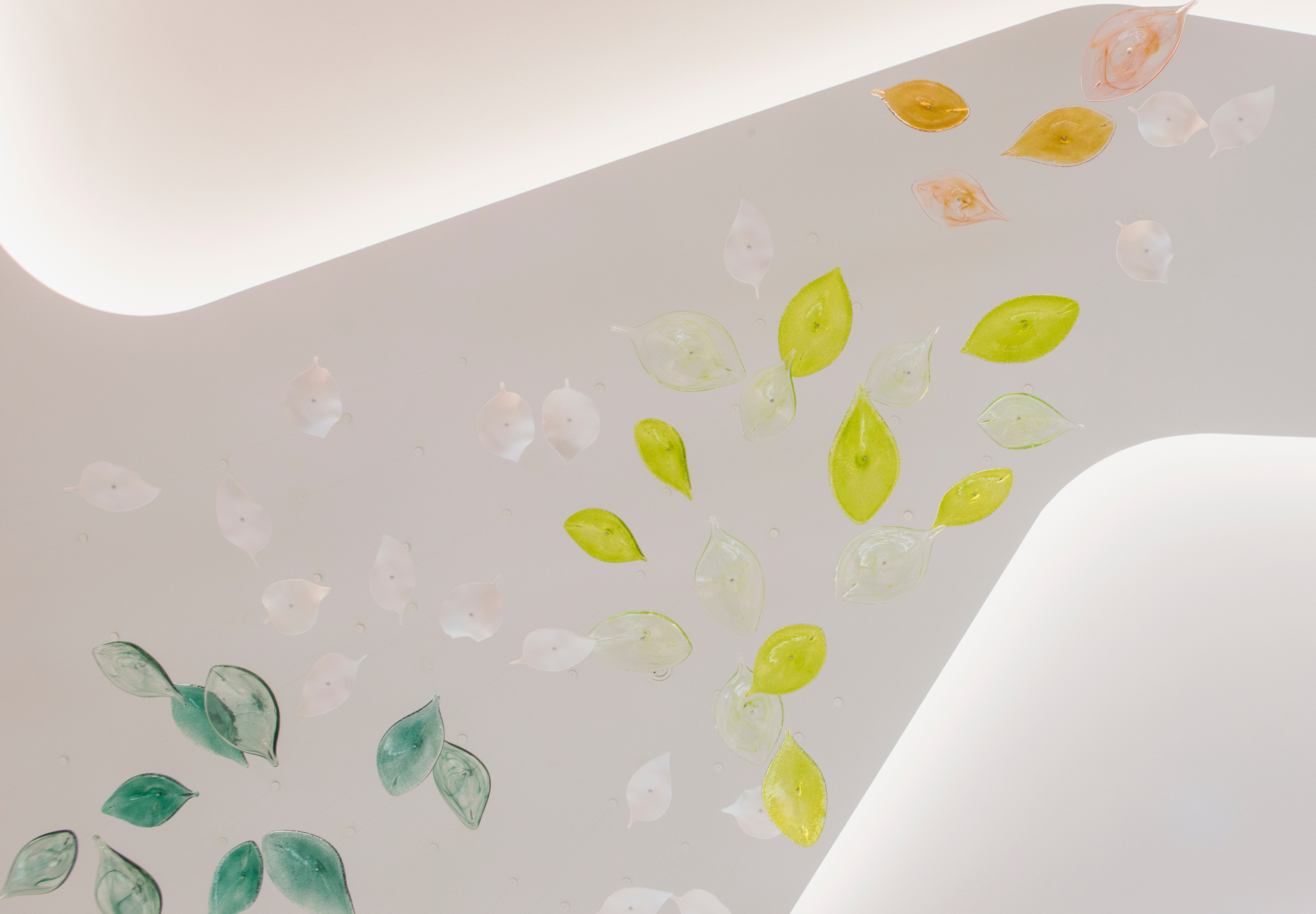 Each individual piece, suspended on near invisible, microfibre stainless steel cables, is uniquely pigmented with swirling veins and crackled textures, evoking the delicate quality of leaves in motion. As visitors journey through the space, the composition appears to flow like a breeze, shifting gradually from fresh spring greens to vibrant summer hues and finally to rich autumnal reds.